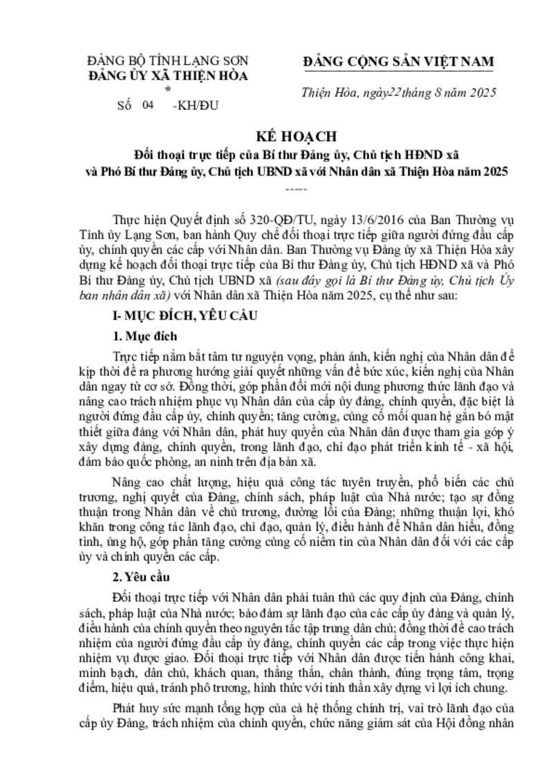 | Tiêu đề văn bản | Kế hoạch đối thoại trực tiếp của Bí thư Đảng ủy, Chủ tịch HĐND xã và Phó Bí thư Đảng ủy, Chủ tịch UBND xã với Nhân dân xã Thiện Hòa năm 2025 | ||