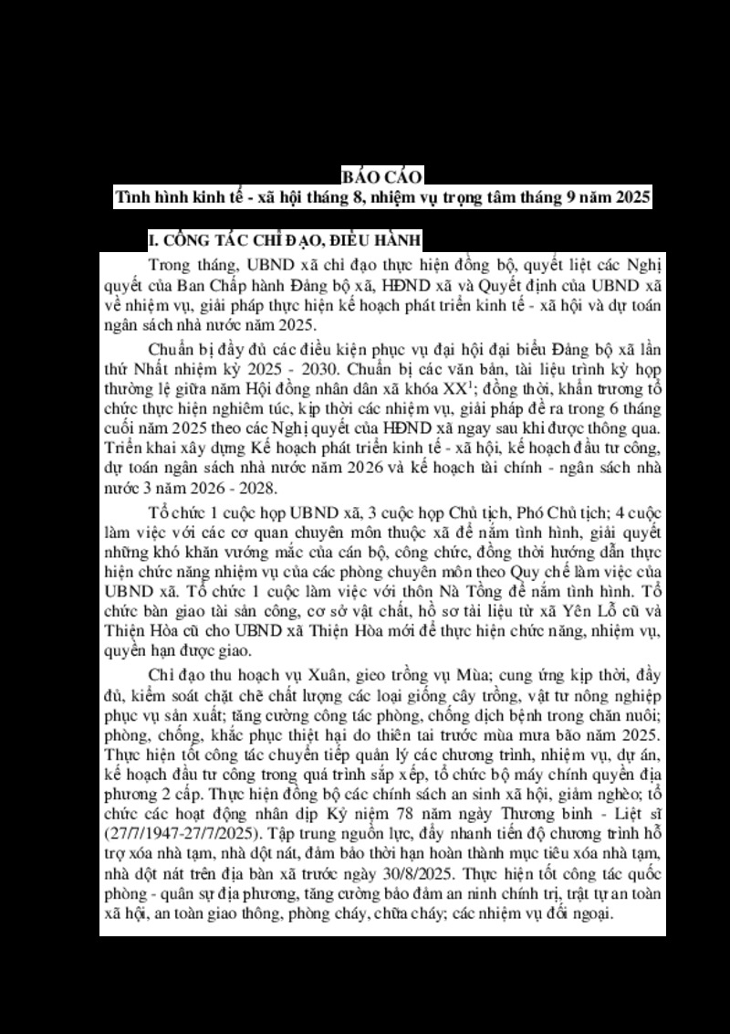 | Tiêu đề văn bản | Báo cáo tình hình kinh tế - xã hội tháng 8, nhiệm vụ trọng tâm tháng 9 năm 2025 của UBND xã Thiện Hòa | ||