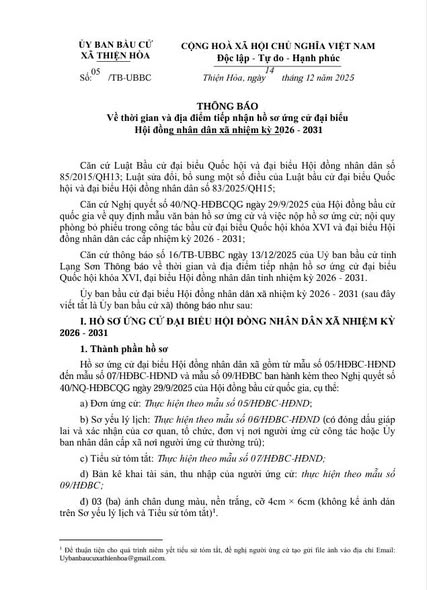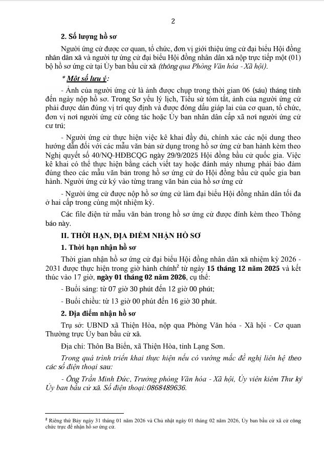 Thông báo thời gian và địa điểm tiếp nhận hồ sơ ứng cử đại biểu Hội đồng nhân dân xã nhiệm kỳ 2026 - 2031