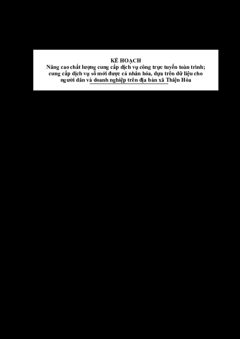 | Tiêu đề văn bản | Kế hoạch nâng cao chất lượng cung cấp dịch vụ công trực tuyến toàn trình; cung cấp dịch vụ số mới được cá nhân hóa, dựa trên dữ liệu cho người dân và doanh nghiệp trên địa bàn xã Thiện Hòa | ||