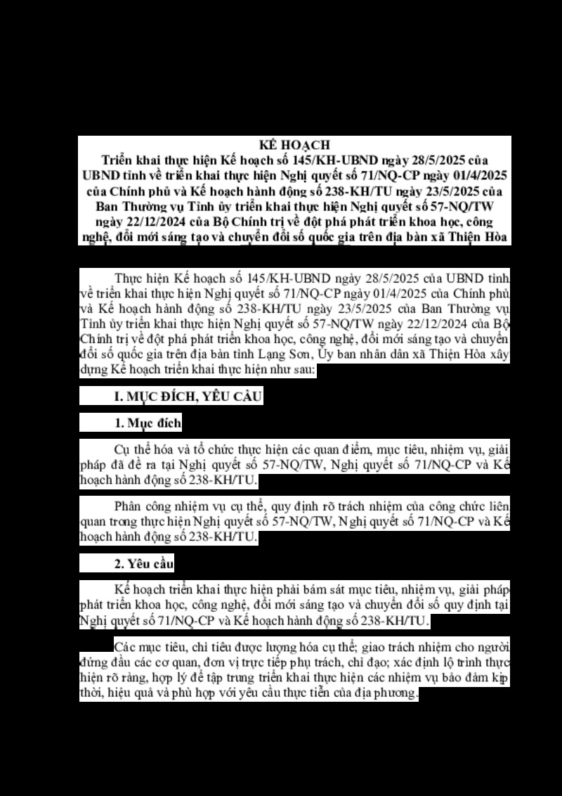 | Tiêu đề văn bản | Kế hoạch triển khai thực hiện Kế hoạch số 145/KH-UBND ngày 28/5/2025 của UBND tỉnh về đột phá phát triển khoa học, công nghệ, đổi mới sáng tạo và chuyển đổi số quốc gia trên địa bàn xã Thiện Hòa | ||